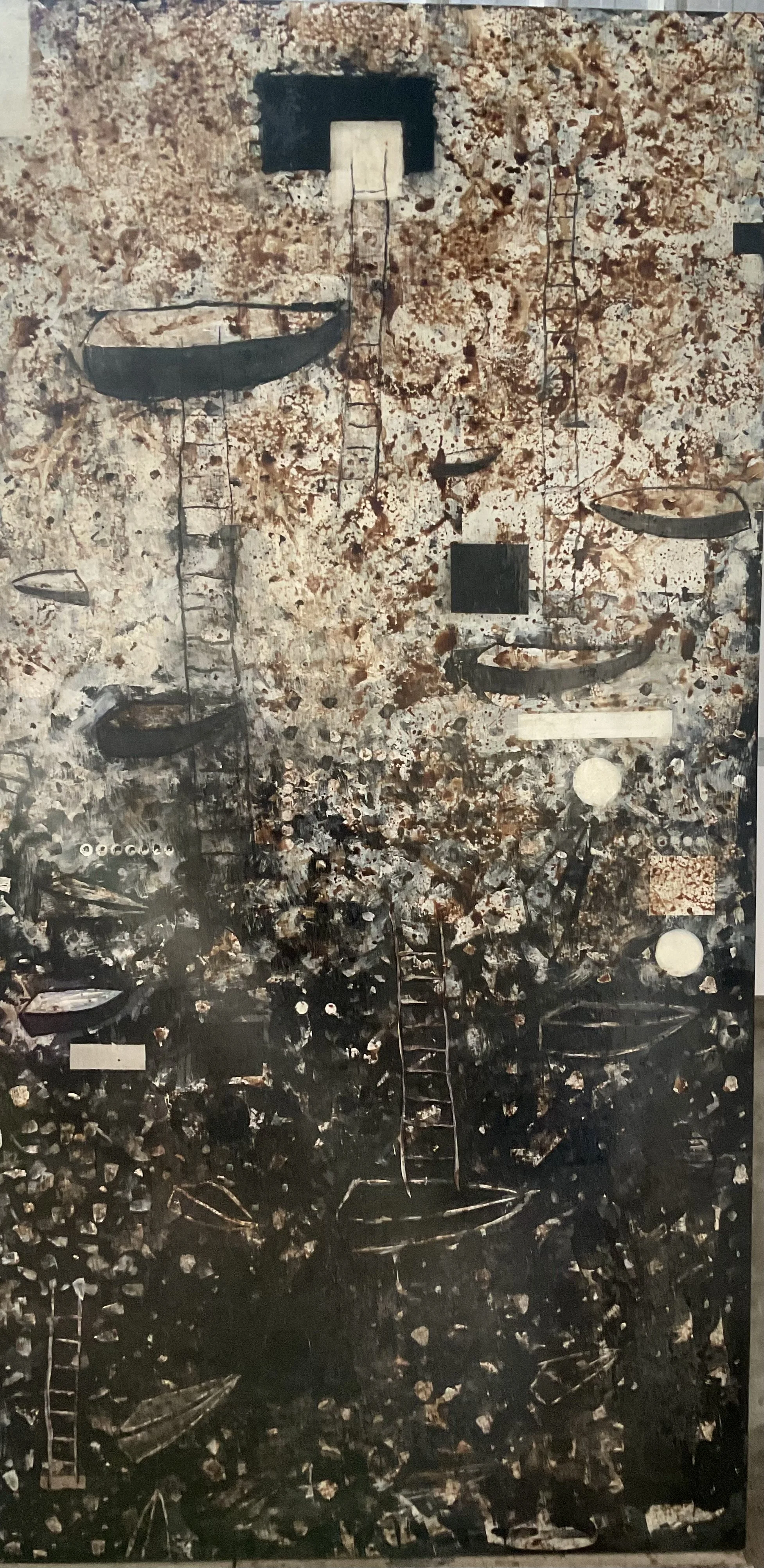 Bajo un sistema simbólico inestable con espacios fragmentados, las pinturas proponen un campo de negociación entre construcción y pérdida, donde el sentido permanece abierto.